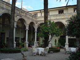 Il convento dei domenicani, oggi uno degli alberghi più famosi d’Italia, fu il primo palazzo-castello (iniziato a costruire nel 1374, fu completato nel 1383) e il terzo monastero a nascere a Taormina. La sua origine e la sua storia sono legate al frate domenicano Damiano Rosso, discendente degli Altavilla e Principe di Cerami. Questi, divenuto frate, donò tutti i suoi beni, compreso il palazzo poi trasformato in convento, all’ordine religioso dei domenicani. Dopo molti secoli il Palazzo passò al Comune di Taormina che lo vendette ai principi di Cerami che, ai primi del ‘900, lo trasformarono in albergo. Le 40 celle dei frati sono state trasformate in eleganti stanze. Rimase aperta al culto solo la Chiesa dell’ex convento (dedicata a Sant’Agata), che però fu distrutta dai bombardamenti del 9 luglio 1943. Sui suoi ruderi sorge oggi la sala congressi dell’albergo, che ancora conserva i resti degli altari minori. All’ex convento si accede attraverso un grande portale secentesco, ove è posto lo stemma dell’ordine monastico dei domenicani, scolpito in marmo. Superata la hall dell’attuale albergo, si nota il chiostro, a pianta quadrata con sette archi, per ogni lato, che poggiano su 29 colonne. Un altro chiostro più piccolo, è costituito da sei arcate per lato, con archi poggianti su 25 colonnine.