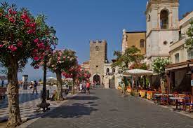 Edificata nel XII sec. su antiche fondamenta greco-romane, è stata più volte distrutta dagli eserciti che nel tempo hanno invaso Taormina e subito dopo ricostruita: l’ultimo restauro risale al 1679, voluta fortemente dai taorminesi; in quella occasione fecero collocare anche il grande orologio. E’ ubicata nella piazza IX Aprile, e di fatto delimita il lato inferiore ed è posta al centro del Corso Umberto. L’edificio, aperto dalla Porta di Mezzo, conduce al Borgo Medievale, separando di fatto questa parte della cittadina dalla Taormina classica ed ellenistica. Questa struttura in pietra è sovrastata da merli, reca un orologio nella sua porzione sommale, mentre la porta propriamente detta si apre in un elegante arco in blocchi di pietra squadrata. Su un preesistente impianto delle mura ellenistiche fu costruita la torre, nel basso Medioevo. Nella seconda metà del 18° secolo si resero necessari interventi di ripristino, dopo che l’originario elemento era stato in parte sinistrato. Studi recenti fanno presumere che la prima torre fu eretta sui resti di una più antica costruzione muraria difensiva, risalente all’epoca dell’origine della città e, cioè, intorno al IV secolo a. C. Questa tesi è suffragata dal fatto che le fondamenta della Torre sono costituite da grossi blocchi squadrati in pietra di Taormina.