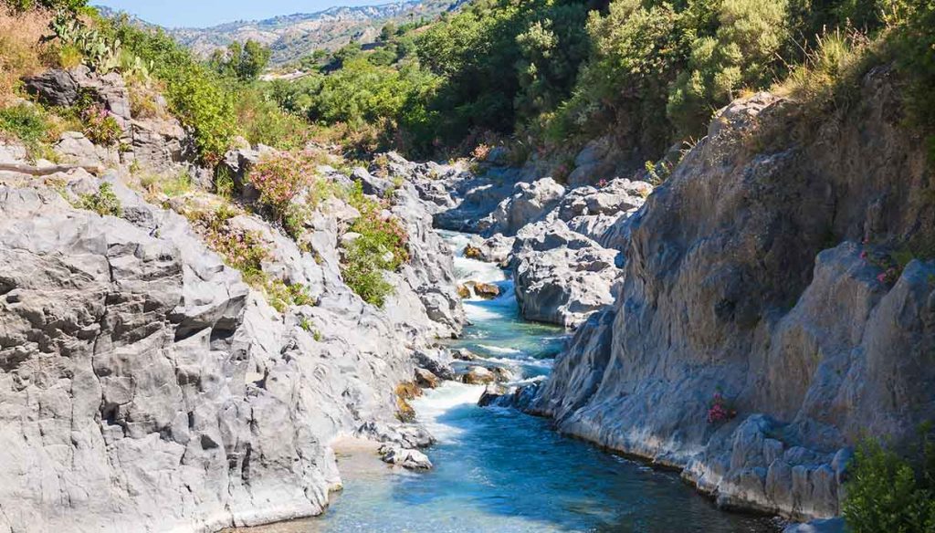 Il fiume Alcantara, così chiamato dagli arabi perchè attraversava mediante un ponte di pietra presso Calatabiano, (al-Qantarah significa appunto il ponte), nasce sui Nebrodi e viene alimentato da una sorgente alle falde dell’Etna, poco sopra Randazzo, e dalle fiumare di Castiglione e di Francavilla. Sono delle gole alte fino a 25 metri e larghe nei punti più stretti 2 metri e nei punti più larghi 4-5 metri; il canyon naturale, a differenza di quanto comunemente si pensa, non è stato scavato nel corso di migliaia di anni dall’acqua. L’ipotesi più accreditata è legata ad un evento sismico che, con un movimento sussultorio fece letteralmente spaccare in due una vecchia colata lavica (attribuita all’Etna), consentendo all’acqua del fiume di insinuarsi al suo interno. Ciò è evidenziato dal fatto che la struttura delle pareti è intatta e spigolosa.
